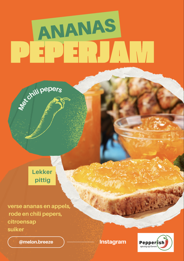 Ingredienten: verse ananas, citrussap, kruiden, suiker, chili pepers.